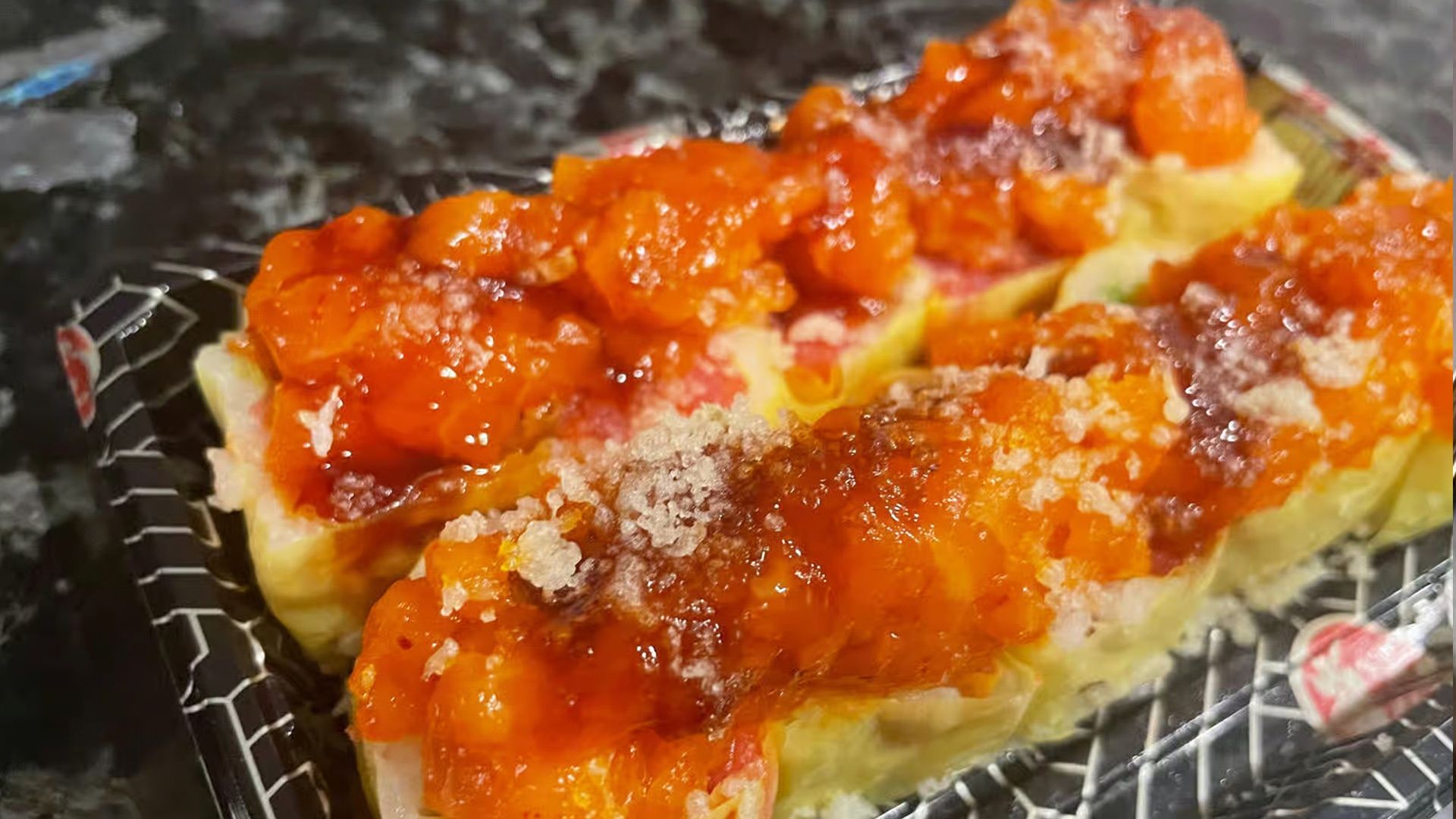 Tempura style spicy crawfish, jalapeno, topped with shrimp, crab salad, eel sauce, and red & green fish egg(8)